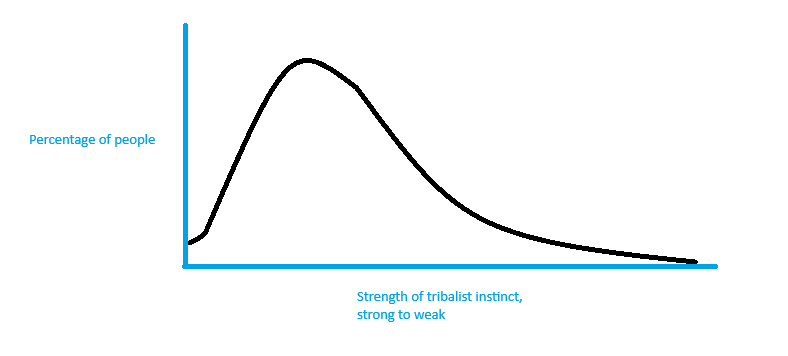 As some do, I think a lot about the human condition and why people do the things they do. As I’m sure I’ve mentioned, the Leskovar Insight plays a major role in how I understand those things. I think of all human characteristics as being on a curve, as I’ve mentioned in Talent Theory. Leskovar’s tribal survival instinct is no exception. Some people have it more than others. In some, the tribal instinct is so strong that they can’t resist it, to the exclusion of reason. In others, it’s weaker; in still others, it barely exists. This curve, however, is taller near the former than the latter (see the crude curve below*). Most people are sufficiently tribal that they will draw their ideas and beliefs from whatever they consider their tribe to be. This is why the propaganda of political elites is so damaging to society. People, by their genetics, are destined to follow political elites forever. From the dawn of human “civilization” to now, we have been plagued by the same problems, repeatedly. Regardless of how advanced intellectual knowledge becomes and how available that information is, the masses are continually swayed by the sophistry of political elites, who intentionally manipulate the tribal instinct for their own self-interest.